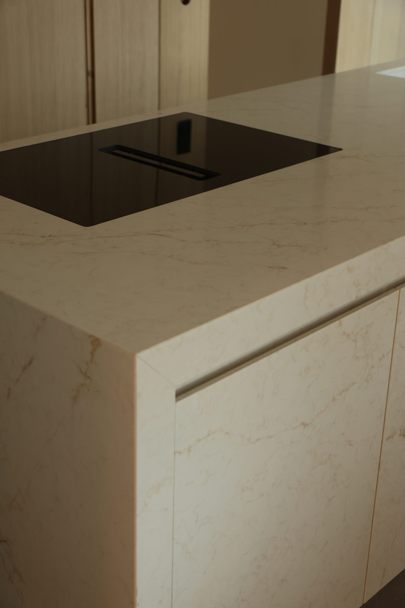 Fronten van het kookeiland zijn uitgevoerd in hetzelfde composiet als het werkblad.
