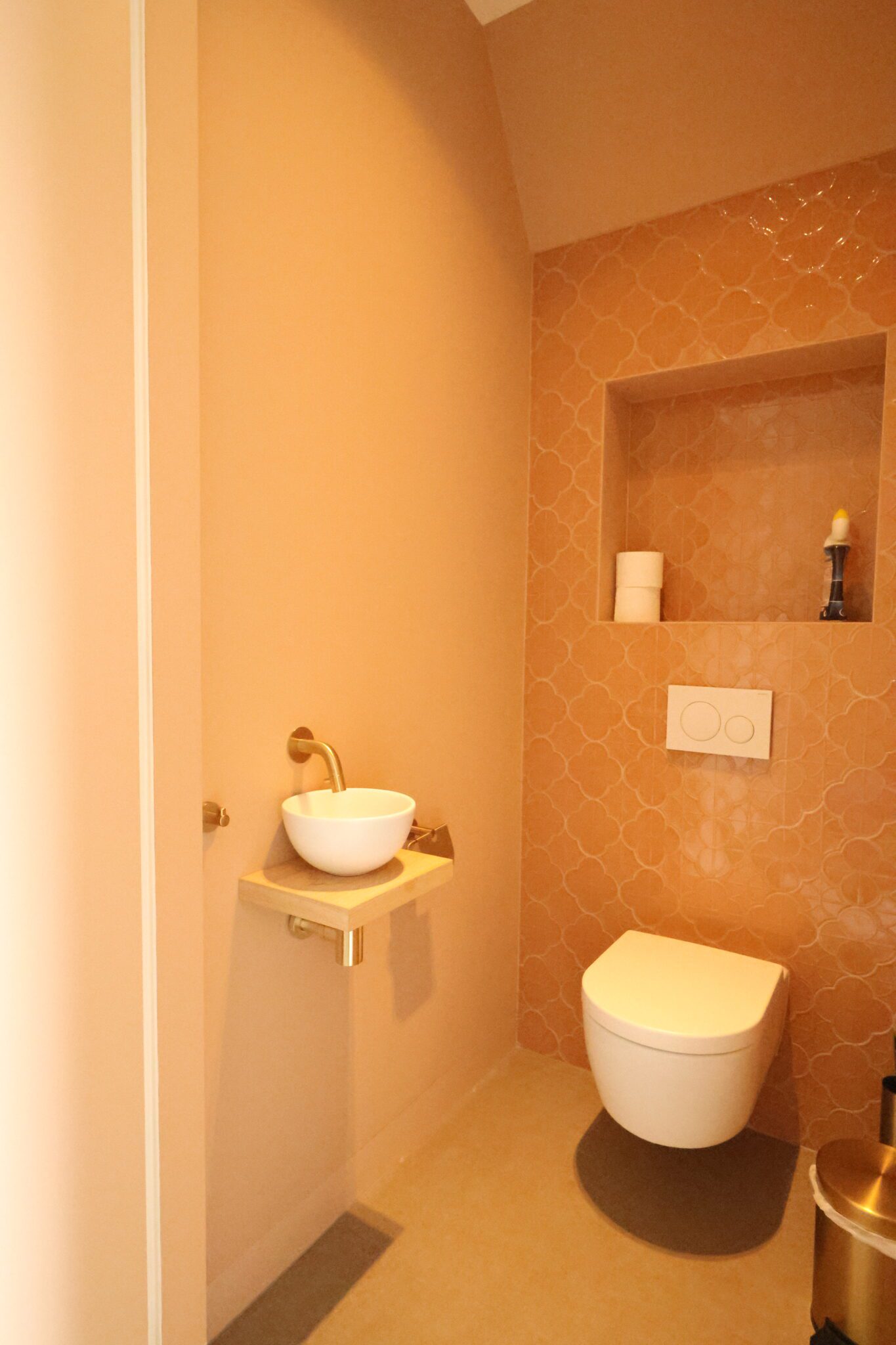 Groene maatwerk keuken met natuurstenen blad en rosé koper accenten