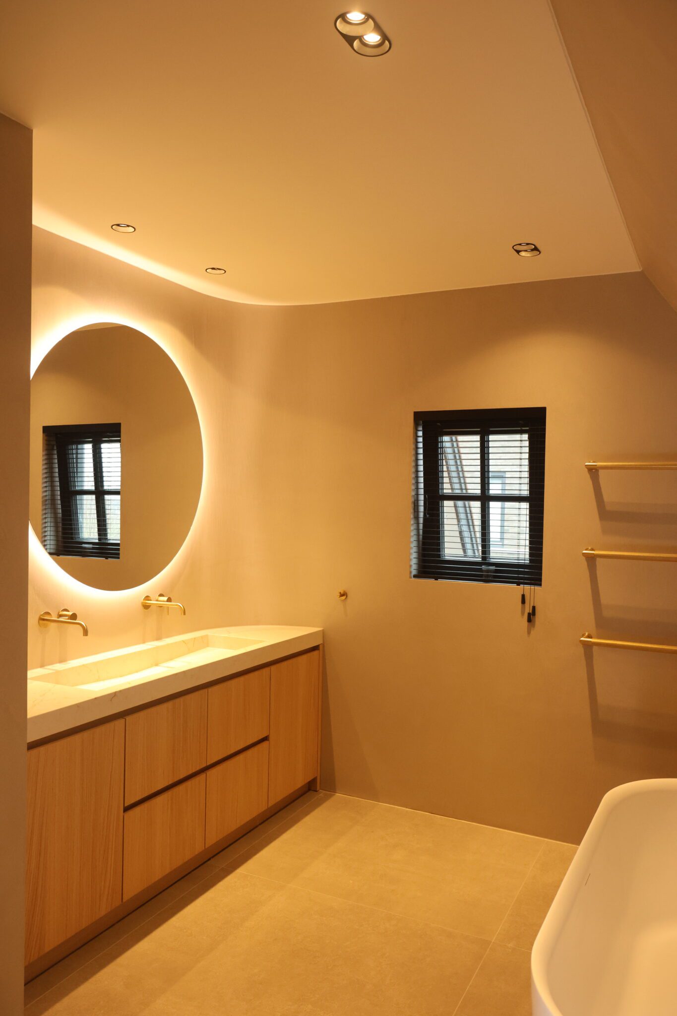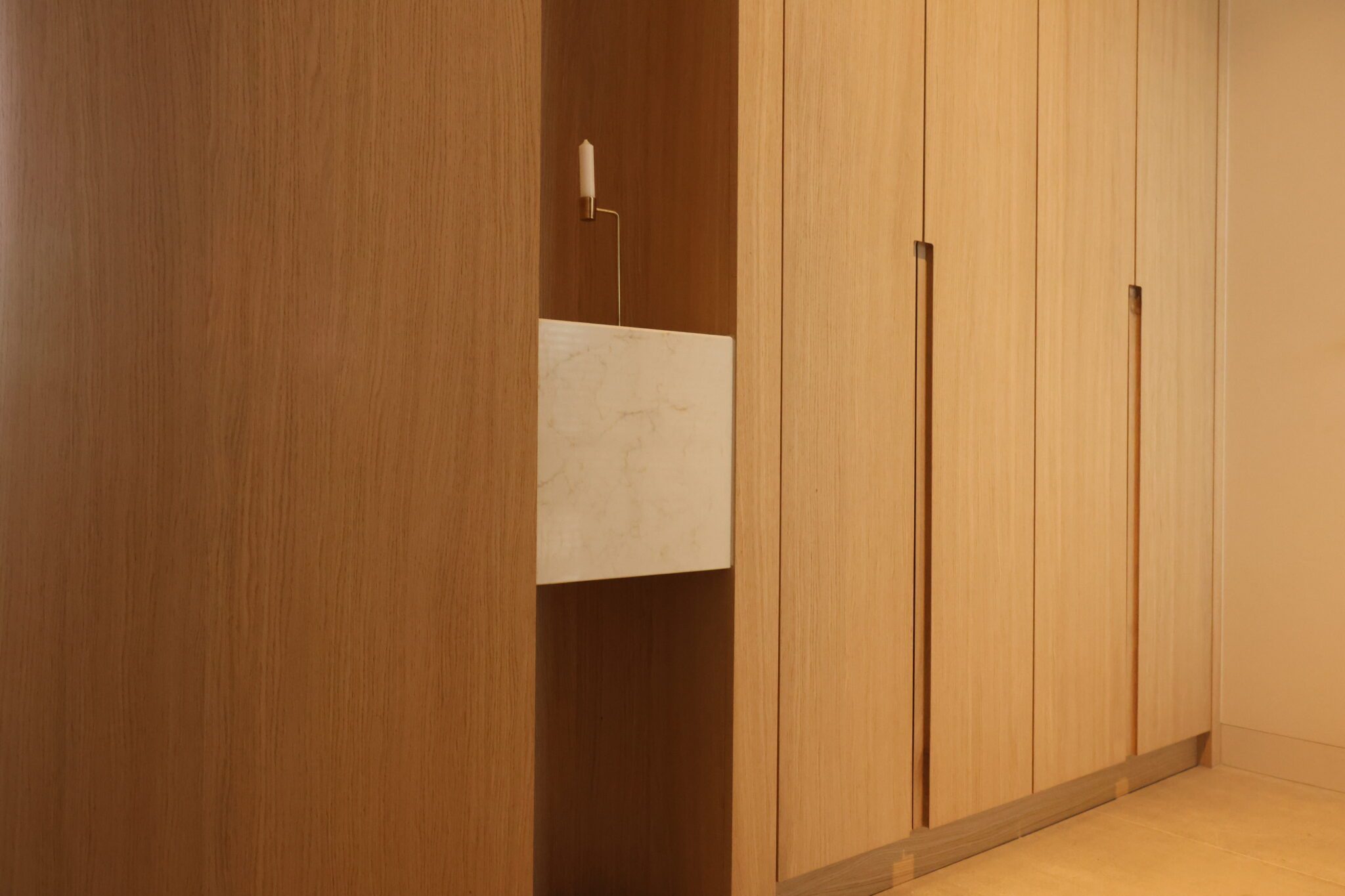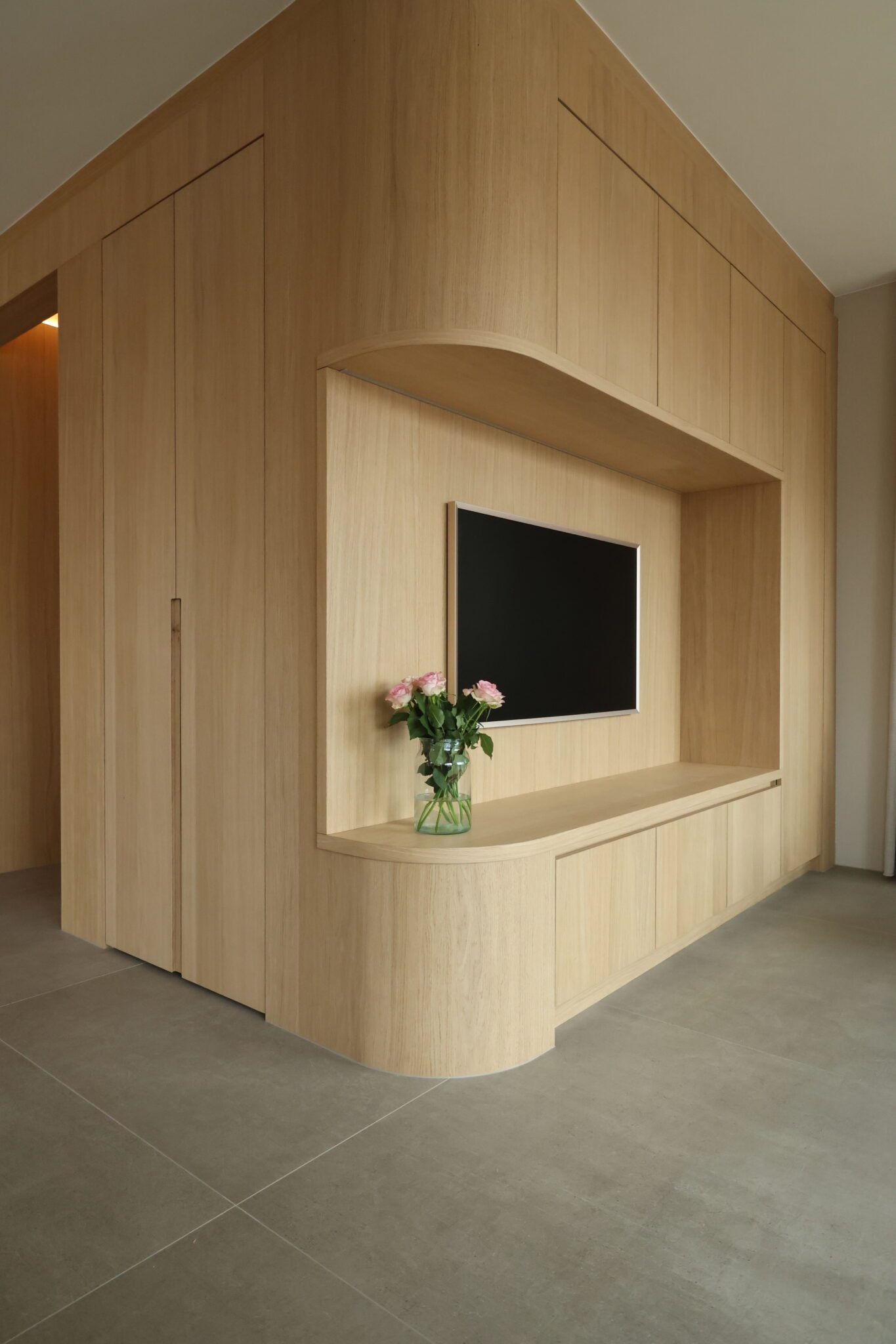 In deze woning realiseerden we een compleet maatwerkinterieur, waarbij alles van entree tot keuken en woonkamer, van slaapkamer tot badkamer een rustig, harmonisch geheel vormen. Door het gebruik van eiken fineer (mat gespoten) en doorlopende lijnen ontstaat rust en samenhang in de hele woning.