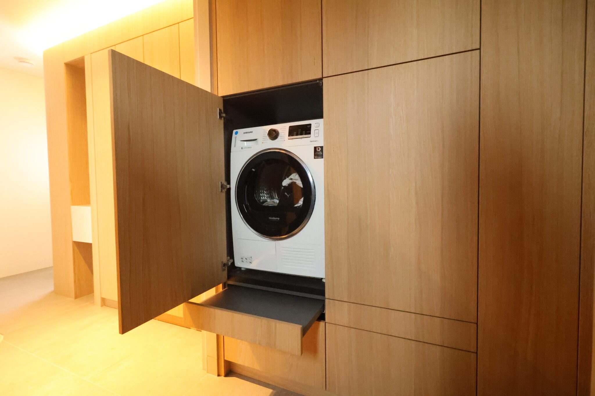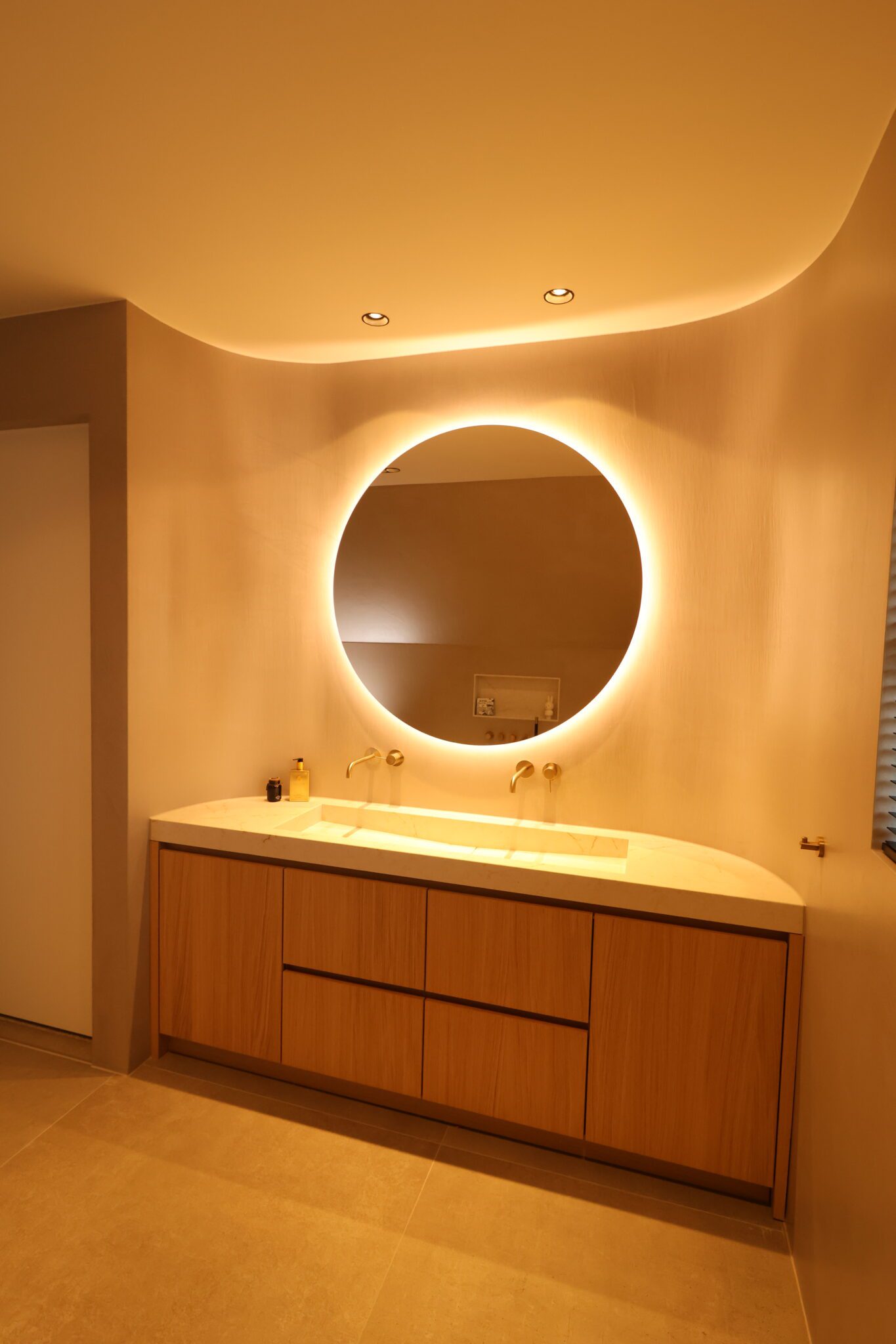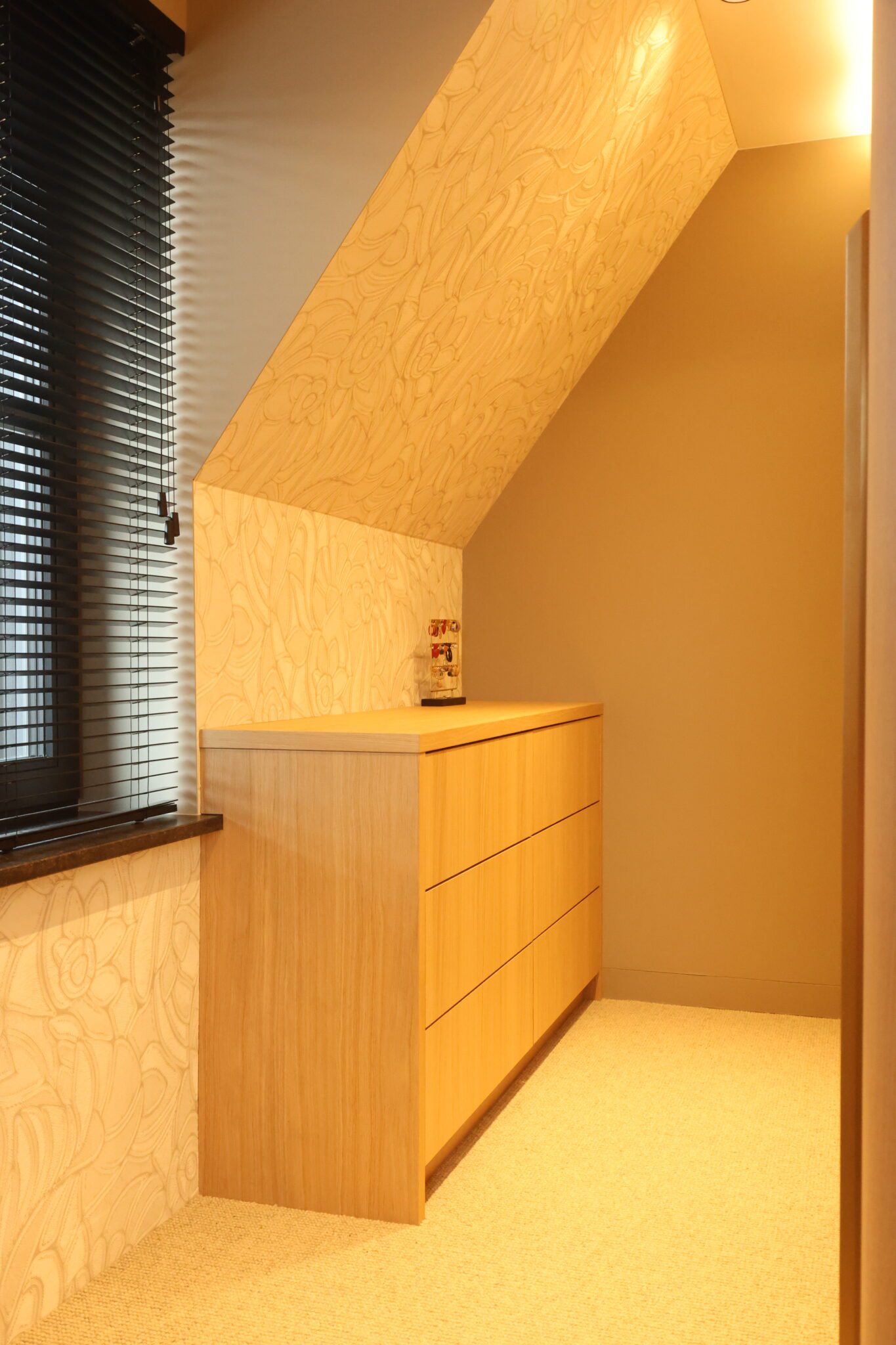 In deze woning realiseerden we een compleet maatwerkinterieur, waarbij alles van entree tot keuken en woonkamer, van slaapkamer tot badkamer een rustig, harmonisch geheel vormen. Door het gebruik van eiken fineer (mat gespoten) en doorlopende lijnen ontstaat rust en samenhang in de hele woning.