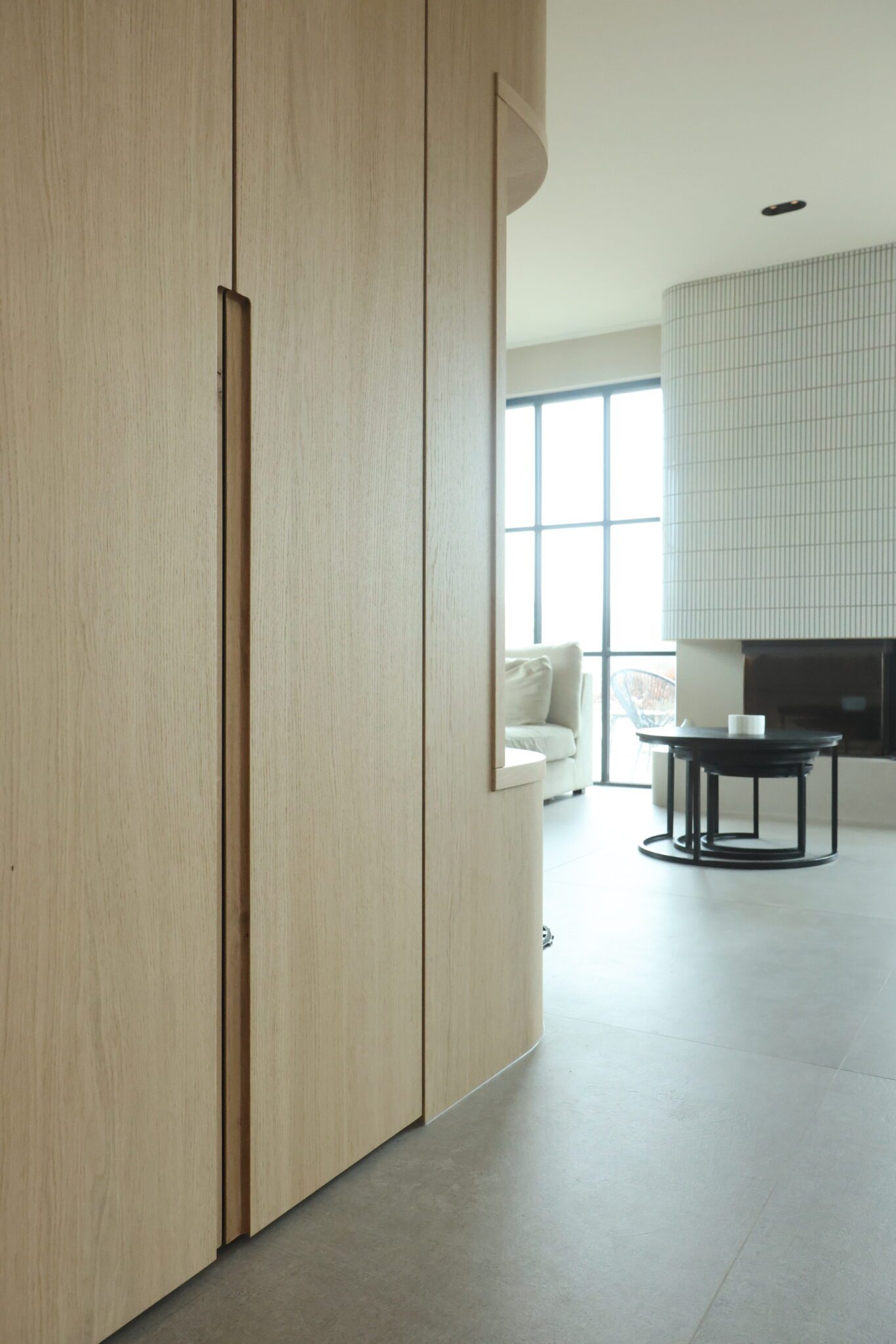 Kenmerkend voor dit project zijn de ingefreesde grepen, het gebruik van massief ogende, gefineerde plaat en de royaal afgeronde hoeken in houtfineer.
